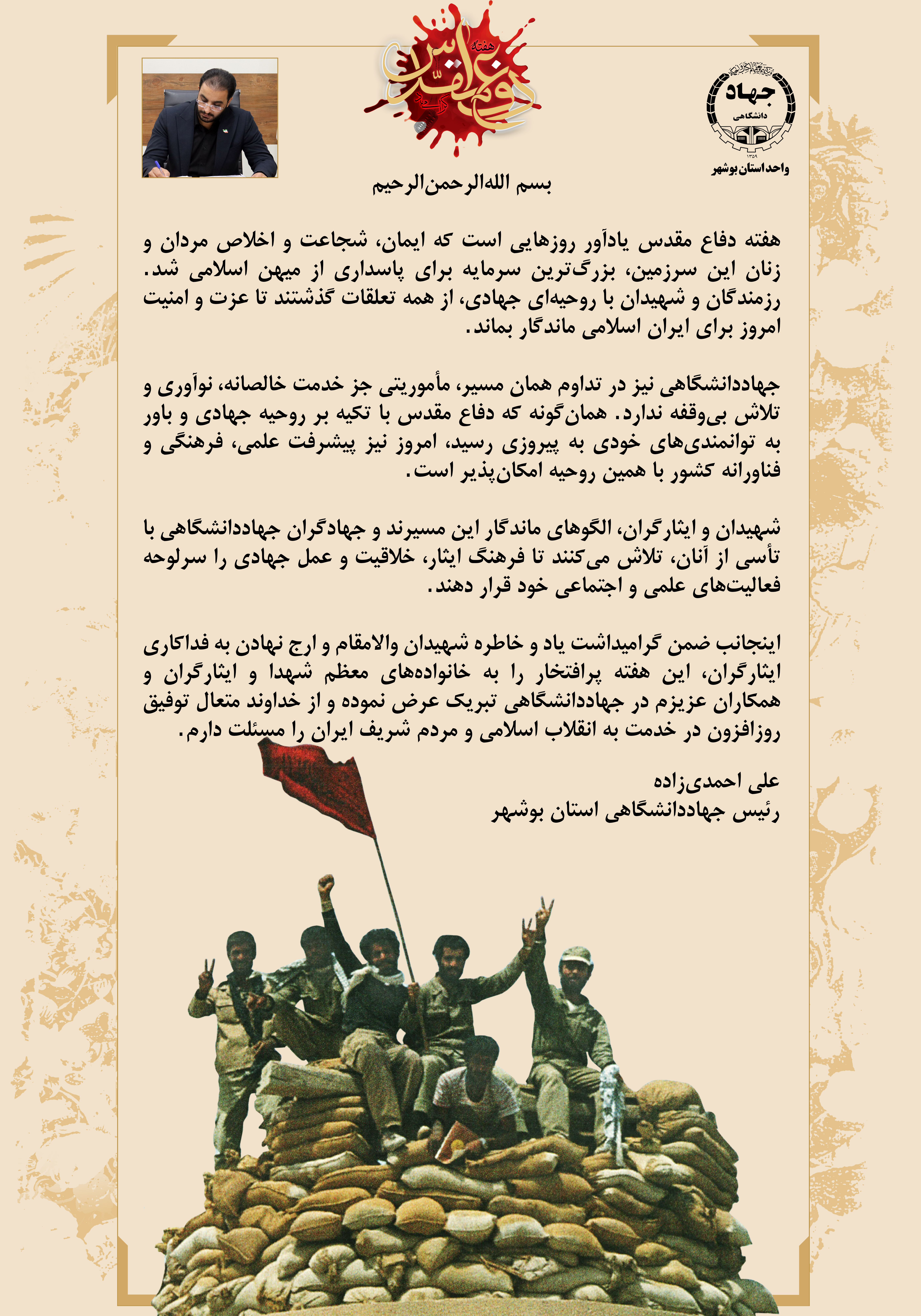 پیام تبریک رئیس جهاددانشگاهی استان بوشهر به مناسبت فرارسیدن هفته دفاع مقدس
