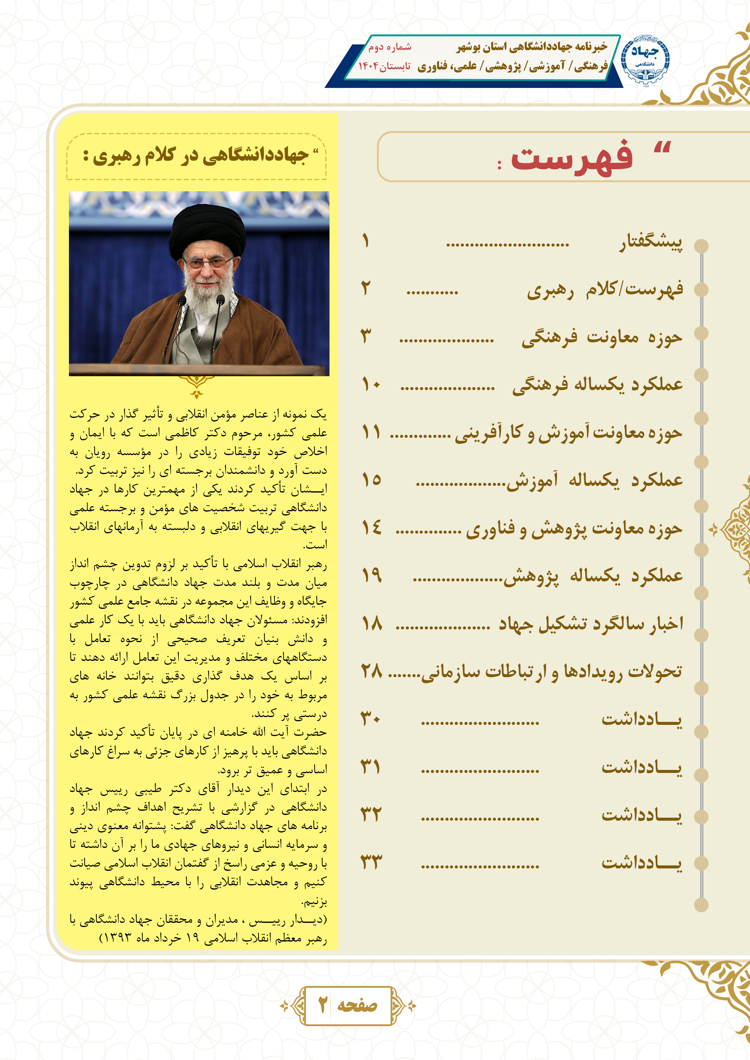 با تکیه بر این دستاوردها، خبرنامه پیشِ رو تلاشی است برای بازنمایی همزمانِ مسئولیتپذیری و نوآوری جهاددانشگاهی استان بوشهر؛ امید است که خوانندگان گرامی در گوشهبهگوشه این صفحات، تصویری از عمل به وعدهها و حرکت در مسیر تعالی را مشاهده کنند.