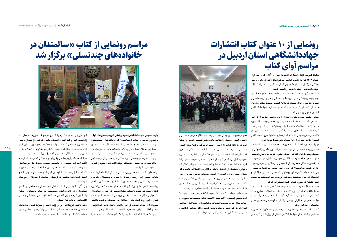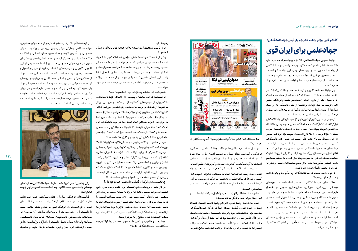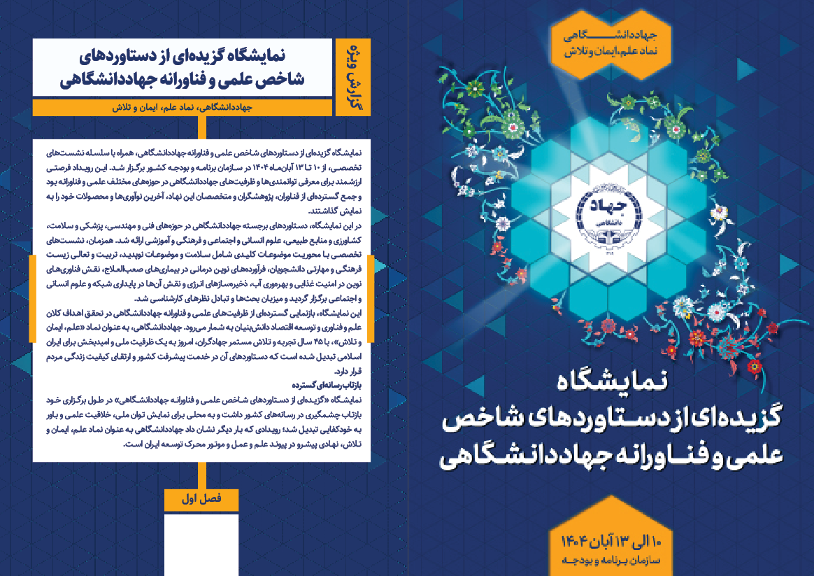 در این شماره با نگاهی ویژه به نمایشگاه گزیده‌ای از دستاوردهای شاخص علمی و فناورانه جهاددانشگاهی موضوعاتی همچون نقش راهبردی این نهاد به‌عنوان بازوی تحقیق و توسعه دولت، گسترش همکاری‌ها با سازمان برنامه و بودجه، شتاب‌گیری اجرای طرح «ایران دیجیتال»، حکمرانی حل مسئله، پیوند دولت و جهاددانشگاهی در مسیر توسعه اقتصادی و اجتماعی، پیشبرد سیاست‌های چابک‌سازی و کاهش هزینه‌ها، خط مقدم جهاد تبیین و تحقق «ما می‌توانیم» و حمایت رئیس‌جمهور از دستاوردهای این نهاد مورد توجه قرار گرفته است.