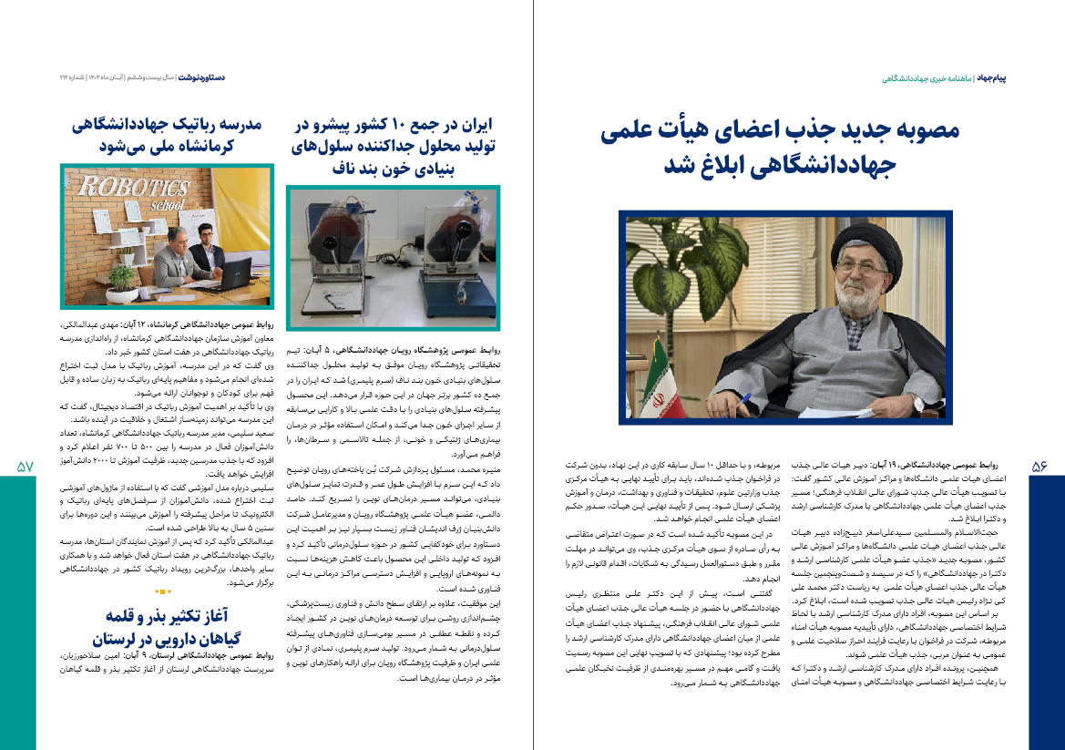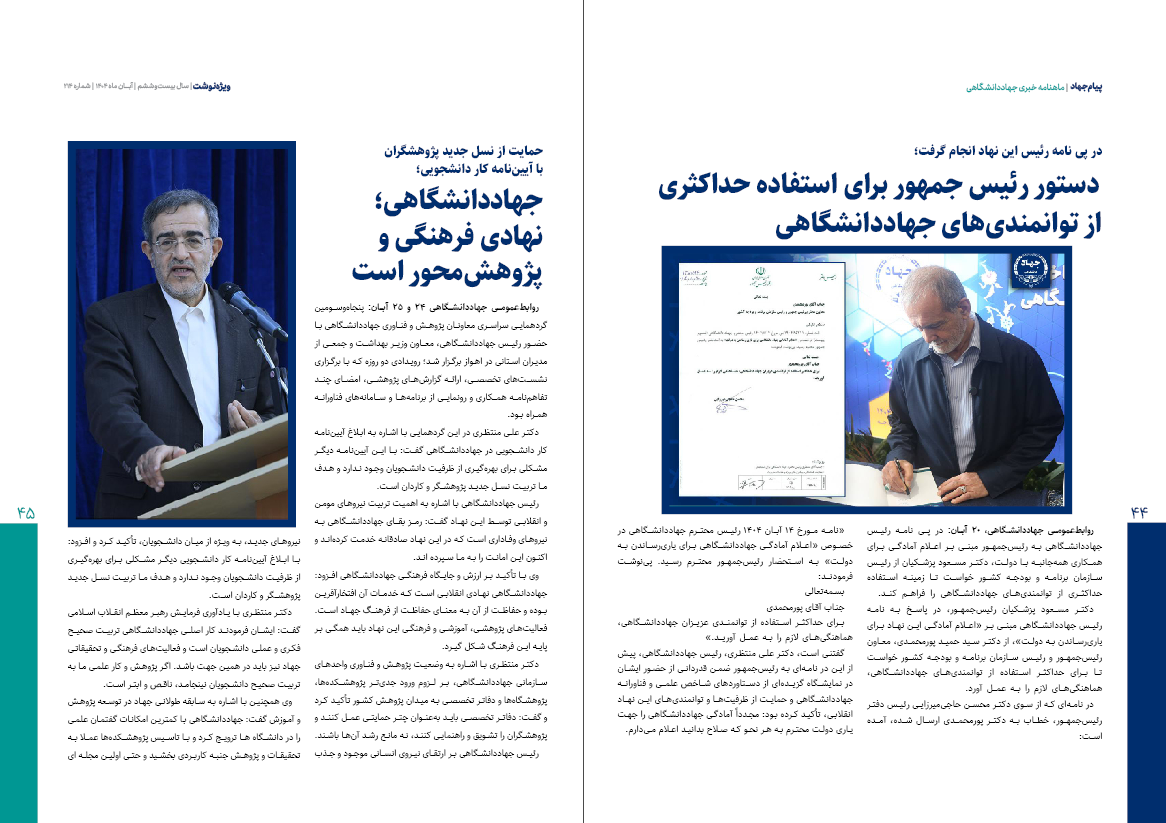 ماهنامه «پیام جهاد» شماره ۲۱۴ منتشر شد / از نمایش دستاوردهای شاخص علمی و فناورانه تا حمایت رئیس‌جمهور از فعالیت‌ها و توانمندی‌های جهاددانشگاهی